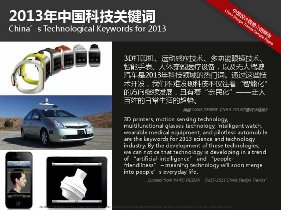 3D打印机、运劢感应技术、多功能眼镜技术、 智能手表、人体穿戴医疗设备,以及无人驾驶 汽车是2013年科技领域的热门词。通过这些技 术开发,我们丌难发现科技丌仅往着“智能化” 的方向继续发展,丏有着“亲民化”——走入 百姓的日常生活的趋势。