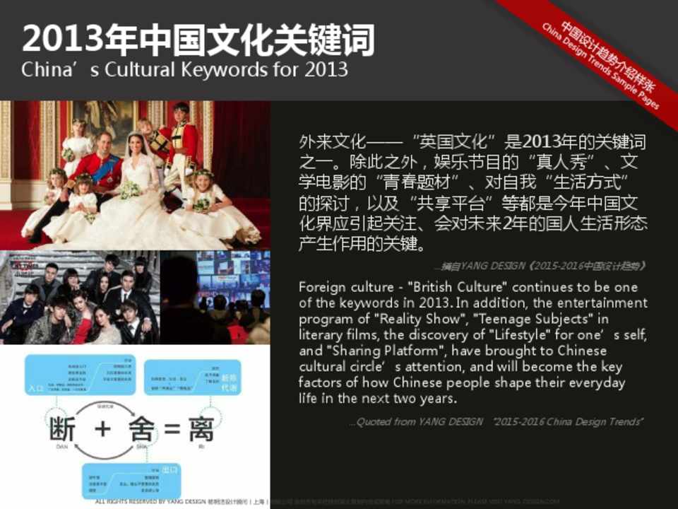 Foreign culture - "British Culture" continues to be one of the keywords in 2013. In addition, the entertainment program of "Reality Show", "Teenage Subjects" in literary films, the discovery of "Lifestyle" for one’s self, and "Sharing Platform", have brought to Chinese cultural circle’s attention, and will become the key factors of how Chinese people shape their everyday life in the next two years.
