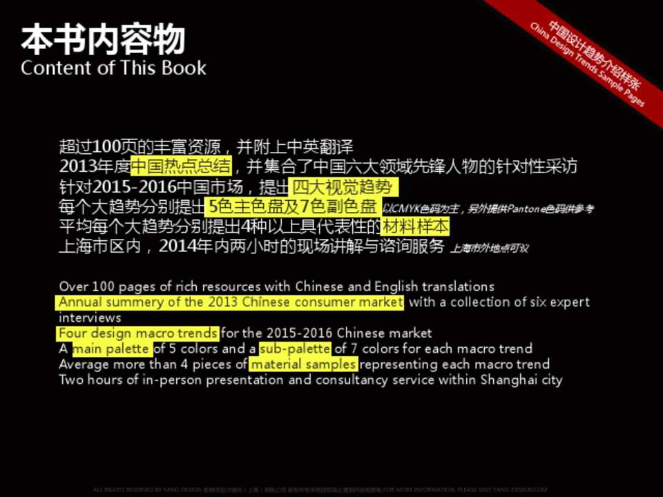 Over 100 pages of rich resources with Chinese and English translations Annual summery of the 2013 Chinese consumer market, with a collection of six expert interviews Four design macro trends for the 2015-2016 Chinese market A main palette of 5 colors and a sub-palette of 7 colors for each macro trend Average more than 4 pieces of material samples representing each macro trend Two hours of in-person presentation and consultancy service within Shanghai city