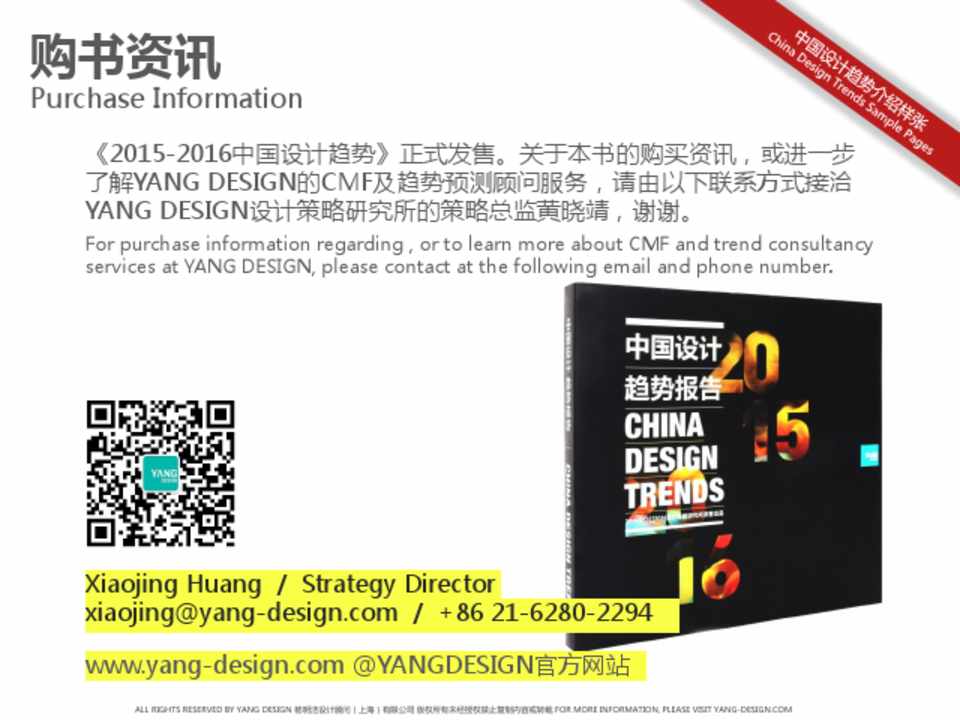 《2015-2016中国设计趋势》正式发售。关于本书的购买资讯,戒进一步 了解YANG DESIGN的CMF及趋势预测顾问服务,请由以下联系方式接洽 YANG DESIGN设计策略研究所的策略总监黄晓靖,谢谢。