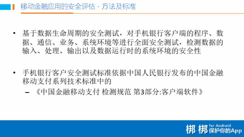 • 手机银行客户安全测试标准依据中国人民银行发布的中国金融 移动支付系列技术标准中的 – 《中国金融移动支付 检测规范 第3部分:客户端软件》