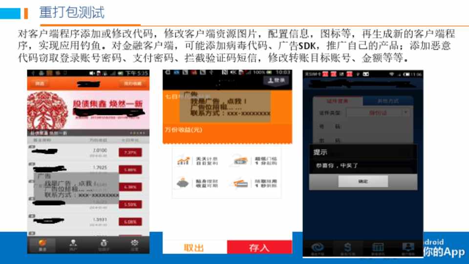对客户端程序添加或修改代码,修改客户端资源图片,配置信息,图标等,再生成新的客户端程 序,实现应用钓鱼。对金融客户端,可能添加病毒代码、广告SDK,推广自己的产品;添加恶意 代码窃取登录账号密码、支付密码、拦截验证码短信,修改转账目标账号、金额等等。