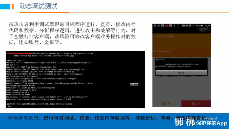 指攻击者利用调试器跟踪目标程序运行,查看、修改内存 代码和数据,分析程序逻辑,进行攻击和破解等行为。对 于金融行业客户端,该风险可修改客户端业务操作时的数 据,比如账号、金额等。