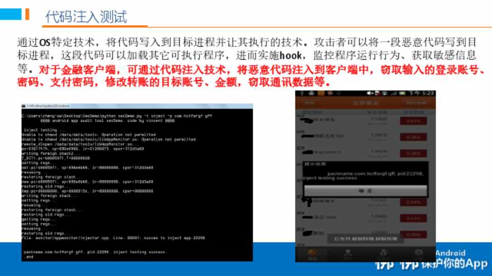 通过OS特定技术,将代码写入到目标进程并让其执行的技术。攻击者可以将一段恶意代码写到目 标进程,这段代码可以加载其它可执行程序,进而实施hook,监控程序运行行为、获取敏感信息 等。对于金融客户端,可通过代码注入技术,将恶意代码注入到客户端中,窃取输入的登录账号、 密码、支付密码,修改转账的目标账号、金额,窃取通讯数据等。