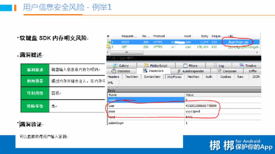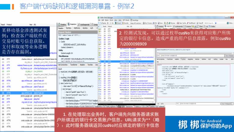 某移动基金渗透测试案 例:检查客户端软件在 交易时账号信息获取、 支付和取现等业务逻辑 是否存在漏洞。