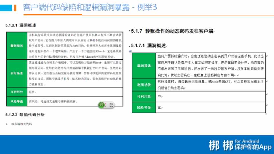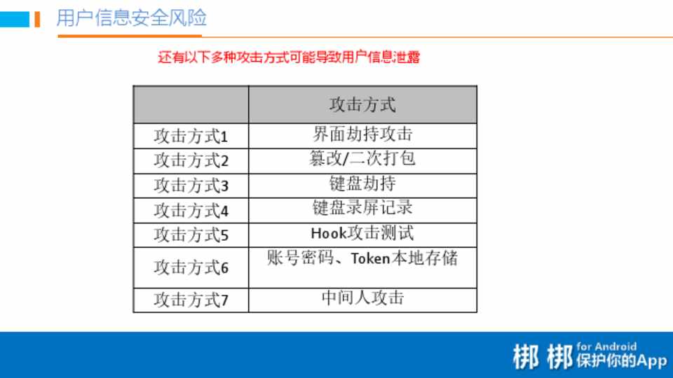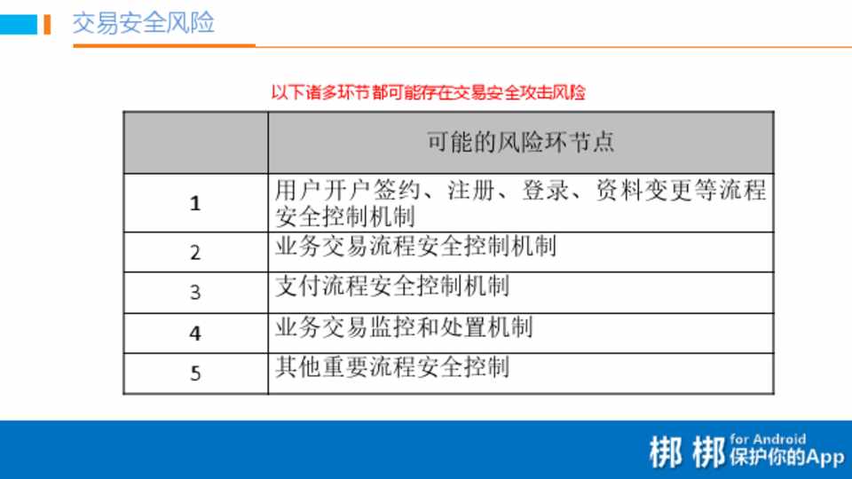 • 用户信息安全风险 • 交易安全风险 • 二次打包风险 • 暴露移动端和服务端漏洞风险