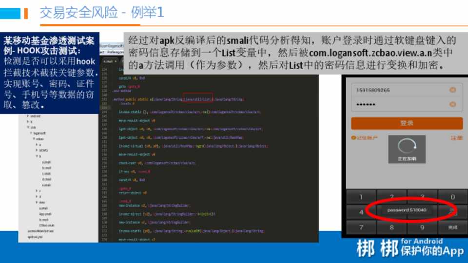 经过对apk反编译后的smali代码分析得知,账户登录时通过软键盘键入的 密码信息存储到一个List变量中,然后被com.logansoft.zcbao.view.a.n类中 的a方法调用(作为参数),然后对List中的密码信息进行变换和加密。