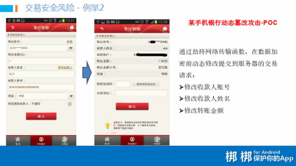 通过劫持网络传输函数,在数据加 密前动态修改提交到服务器的交易 请求: 修改收款人账号 修改收款人姓名 修改转账金额