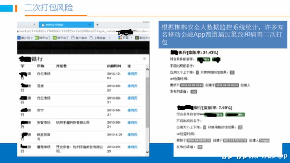根据梆梆安全大数据监控系统统计,许多知 名移动金融App都遭遇过篡改和病毒二次打 包