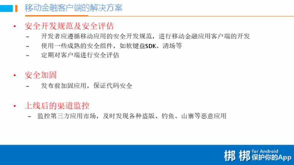 开发者应遵循移动应用的安全开发规范,进行移动金融应用客户端的开发  使用一些成熟的安全组件,如软键盘SDK、清场等  定期对客户端进行安全评估