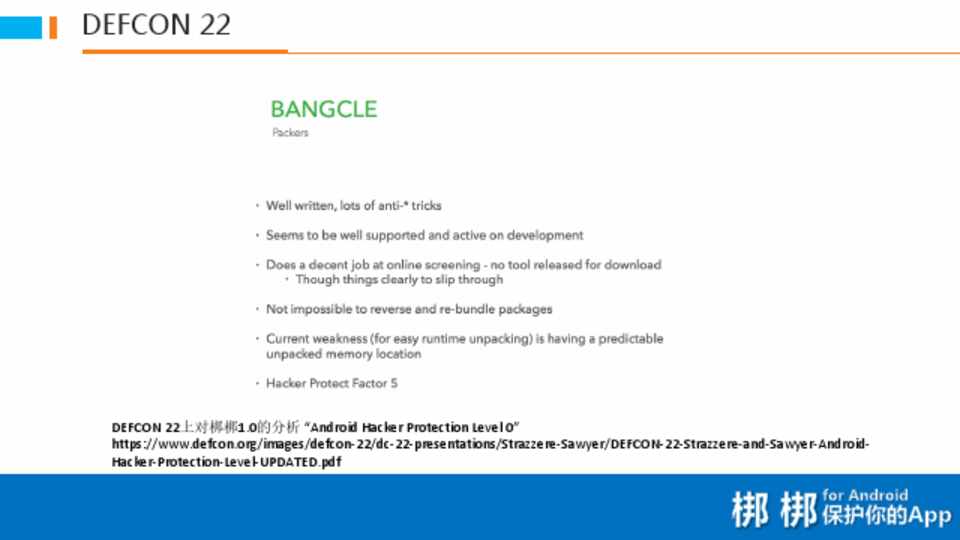 DEFCON 22上对梆梆1.0的分析 “Android Hacker Protection Level 0” https://www.defcon.org/images/defcon-22/dc-22-presentations/Strazzere-Sawyer/DEFCON-22-Strazzere-and-Sawyer-AndroidHacker-Protection-Level-UPDATED.pdf