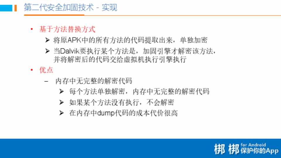 • 基于方法替换方式  将原APK中的所有方法的代码提取出来,单独加密  当Dalvik要执行某个方法是,加固引擎才解密该方法, 并将解密后的代码交给虚拟机执行引擎执行