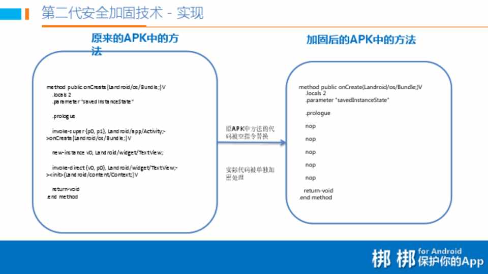• classes.dex被完整加密,放到APK的资源中 • 运行时修改程序入口,将classes.dex在内存中解密并让Dalvik