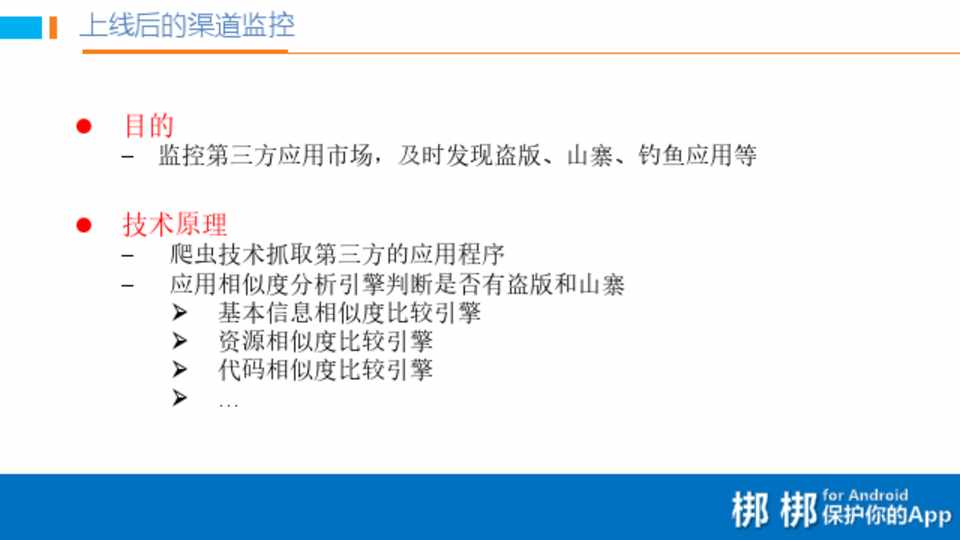 防止反编译,逆向分析,动态注入攻击等等 • 上线后的渠道监测