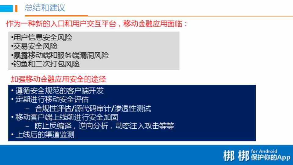 1.根据我们的安全实验室统计测试,国内大多数移动金融 App这几项安全测试都是未通过的,移动安全机制存在缺 失