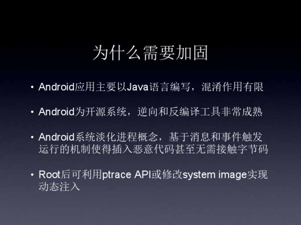 • Android系统淡化进程概念,基于消息和事件触发 运行的机制使得插入恶意代码甚至无需接触字节码