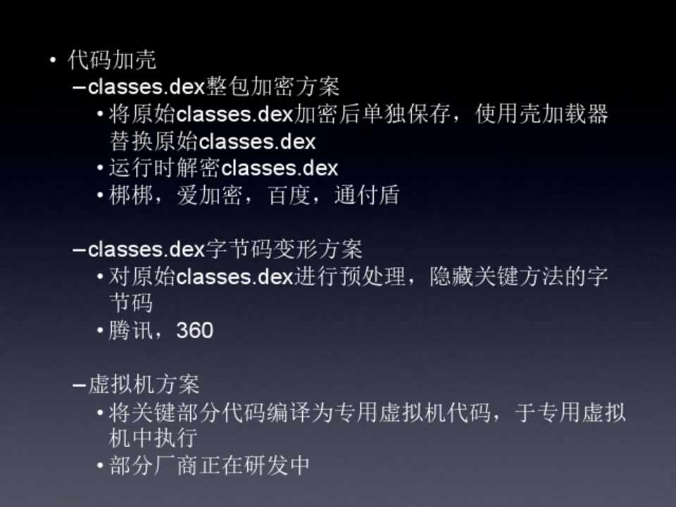 – classes.dex字节码变形方案 • 对原始classes.dex进行预处理,隐藏关键方法的字 节码 • 腾讯,360