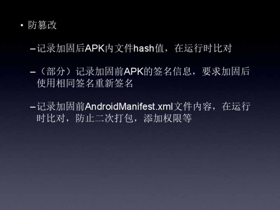 – 记录加固前AndroidManifest.xml文件内容,在运行 时比对,防止二次打包,添加权限等