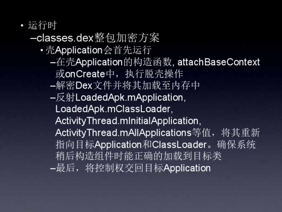 • 壳Application会首先运行 –在壳Application的构造函数, attachBaseContext 或onCreate中,执行脱壳操作 –解密Dex文件并将其加载至内存中 –反射LoadedApk.mApplication,