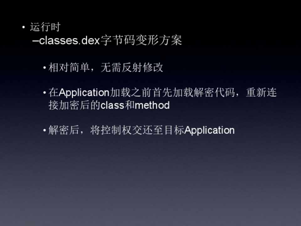 • 在Application加载之前首先加载解密代码,重新连 接加密后的class和method