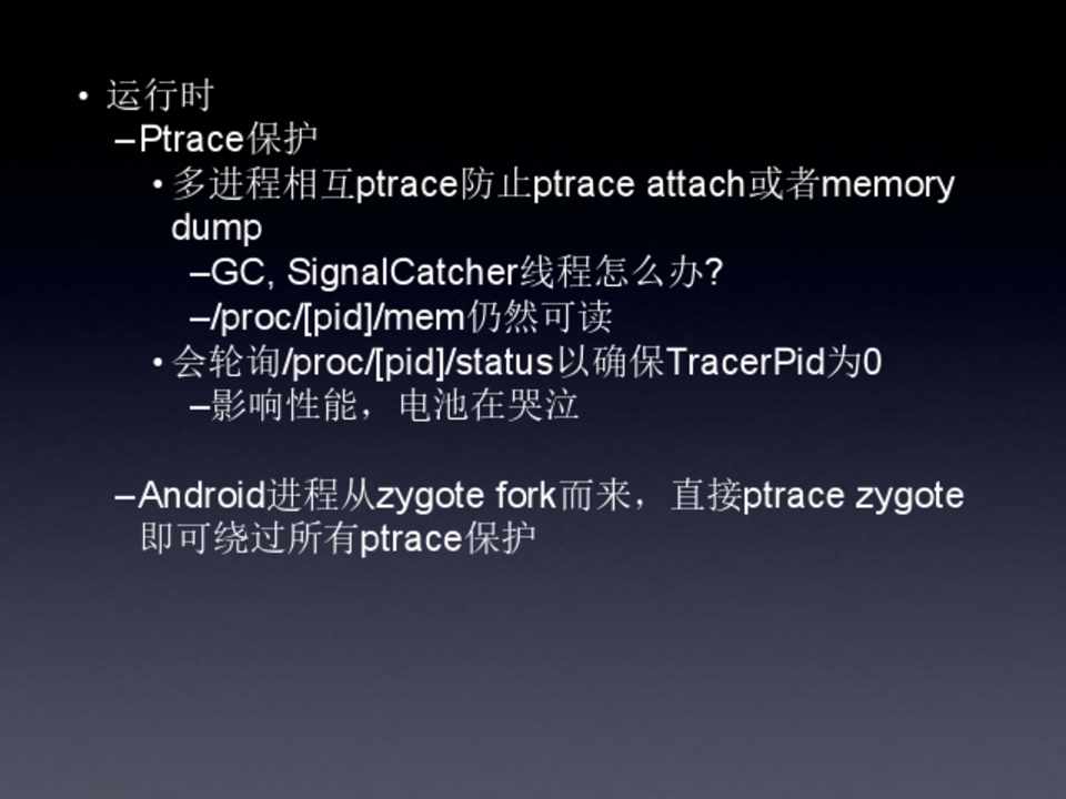 • 运行时 – Ptrace保护 • 多进程相互ptrace防止ptrace attach或者memory dump –GC, SignalCatcher线程怎么办? –/proc/[pid]/mem仍然可读 • 会轮询/proc/[pid]/status以确保TracerPid为0 –影响性能,电池在哭泣