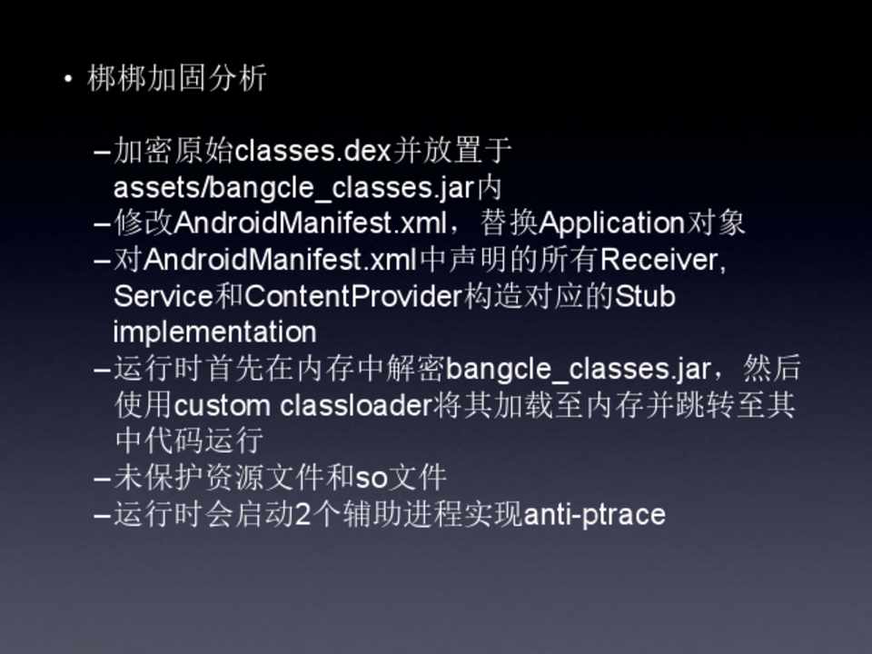 Service和ContentProvider构造对应的Stub implementation – 运行时首先在内存中解密bangcle_classes.jar,然后 使用custom classloader将其加载至内存并跳转至其 中代码运行 – 未保护资源文件和so文件 – 运行时会启动2个辅助进程实现anti-ptrace