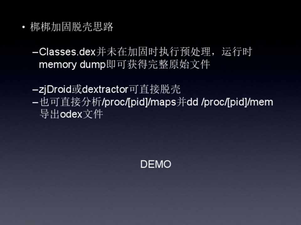• 梆梆加固脱壳思路 – Classes.dex并未在加固时执行预处理,运行时 memory dump即可获得完整原始文件 – zjDroid或dextractor可直接脱壳 –也可直接分析/proc/[pid]/maps并dd /proc/[pid]/mem 导出odex文件