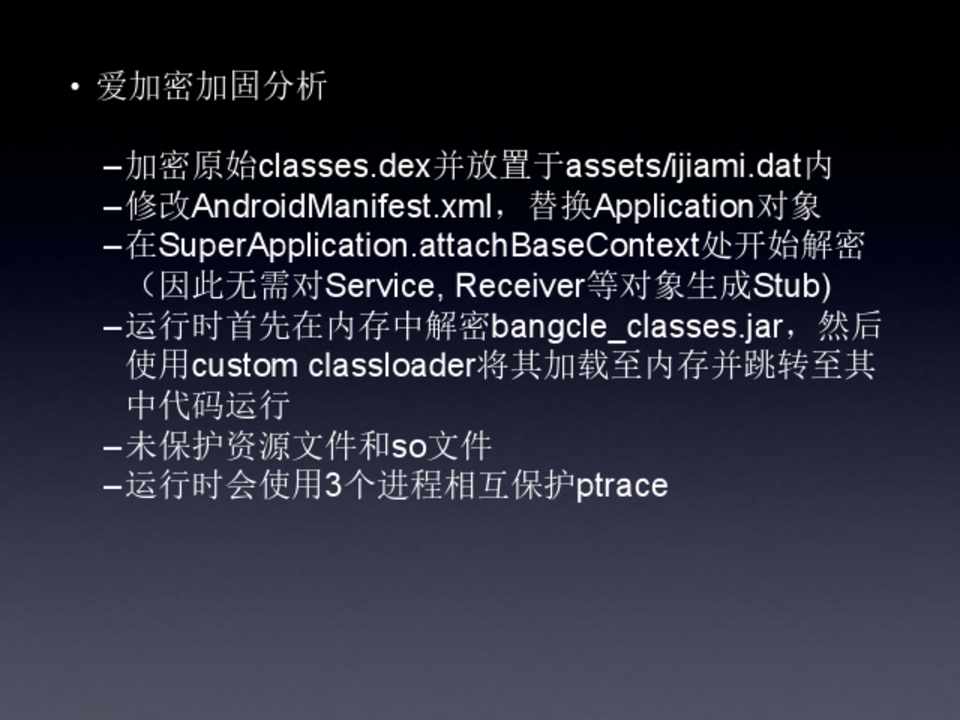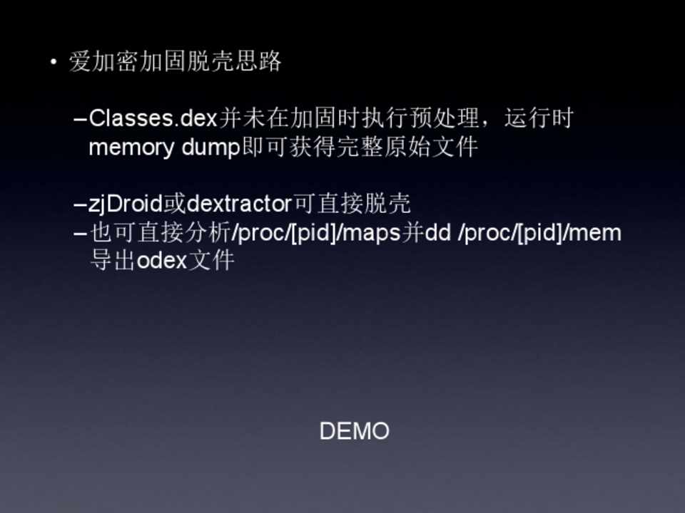 • 爱加密加固脱壳思路 – Classes.dex并未在加固时执行预处理,运行时 memory dump即可获得完整原始文件 – zjDroid或dextractor可直接脱壳 –也可直接分析/proc/[pid]/maps并dd /proc/[pid]/mem 导出odex文件