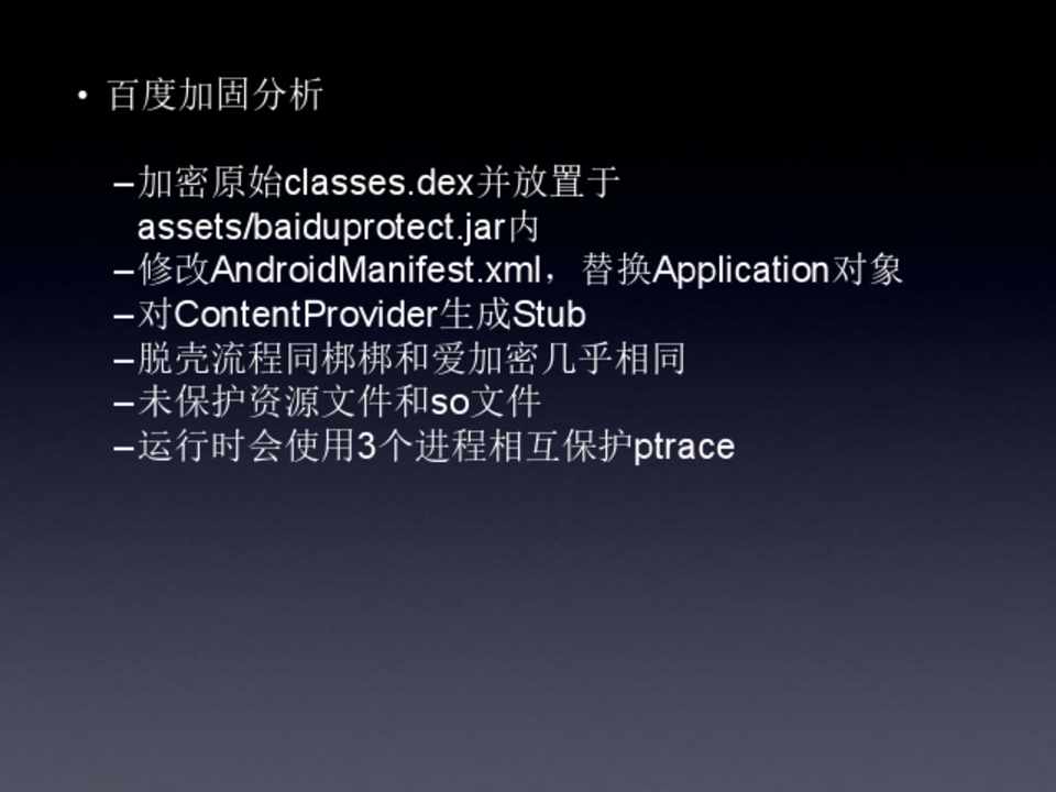 • 百度加固脱壳思路 – Classes.dex并未在加固时执行预处理,运行时 memory dump即可获得完整原始文件 – zjDroid或dextractor可直接脱壳 –也可直接分析/proc/[pid]/maps并dd /proc/[pid]/mem 导出odex文件