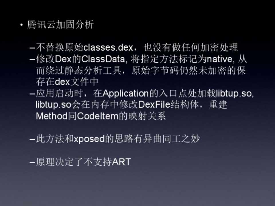 而绕过静态分析工具,原始字节码仍然未加密的保 存在dex文件中 – 应用启动时,在Application的入口点处加载libtup.so, libtup.so会在内存中修改DexFile结构体,重建 Method同CodeItem的映射关系