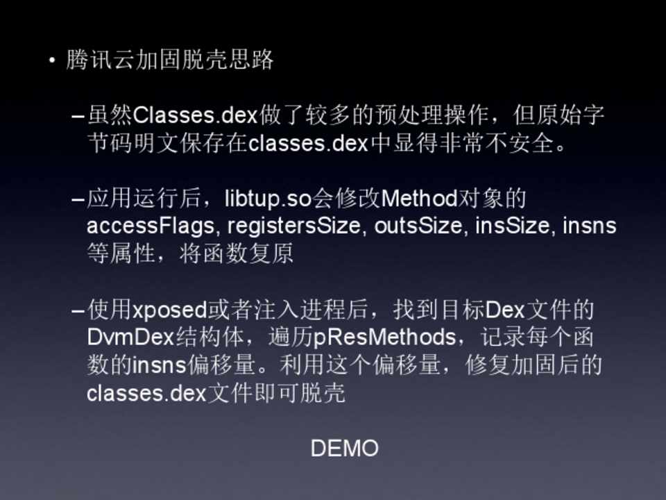 – 使用xposed或者注入进程后,找到目标Dex文件的 DvmDex结构体,遍历pResMethods,记录每个函 数的insns偏移量。利用这个偏移量,修复加固后的 classes.dex文件即可脱壳
