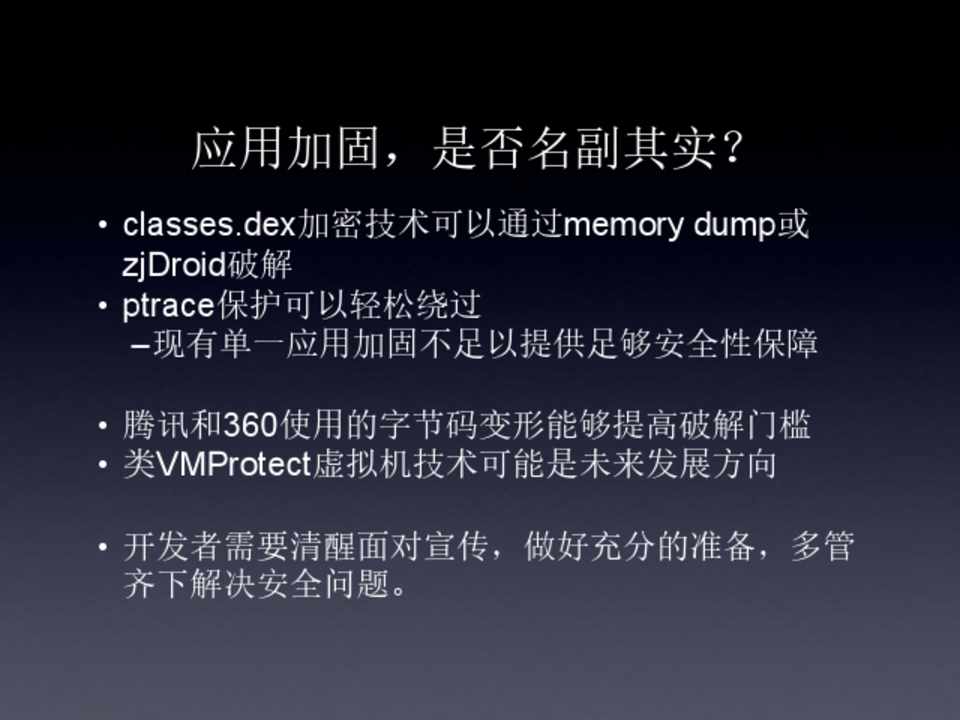 • ptrace保护可以轻松绕过 – 现有单一应用加固不足以提供足够安全性保障