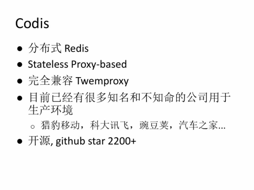 ● 分布式 Redis ● Stateless Proxy-based ● 完全兼容 Twemproxy ● 目前已经有很多知名和不知命的公司用于