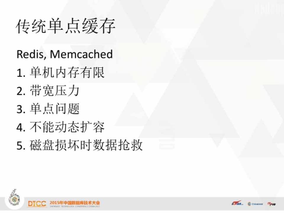Redis, Memcached 1. 单机内存有限 2. 带宽压力 3. 单点问题 4. 不能动态扩容 5. 磁盘损坏时数据抢救