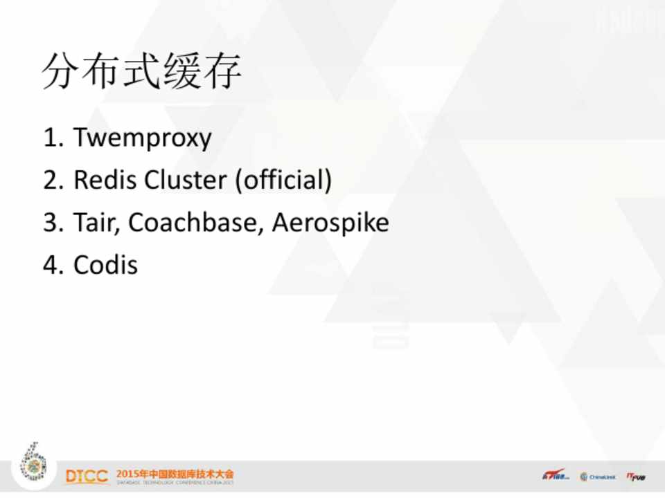 1. Twemproxy 2. Redis Cluster (official) 3. Tair, Coachbase, Aerospike 4. Codis