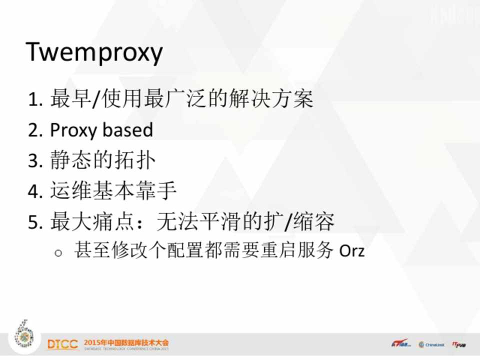1. 最早/使用最广泛的解决方案 2. Proxy based 3. 静态的拓扑 4. 运维基本靠手 5. 最大痛点:无法平滑的扩/缩容