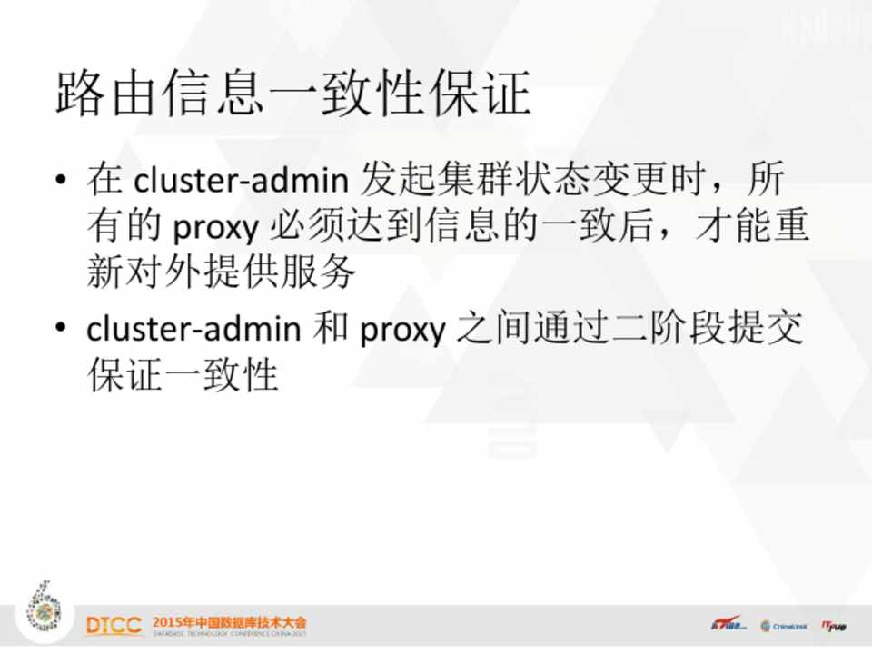 • 在 cluster-admin 发起集群状态变更时,所 有的 proxy 必须达到信息的一致后,才能重 新对外提供服务