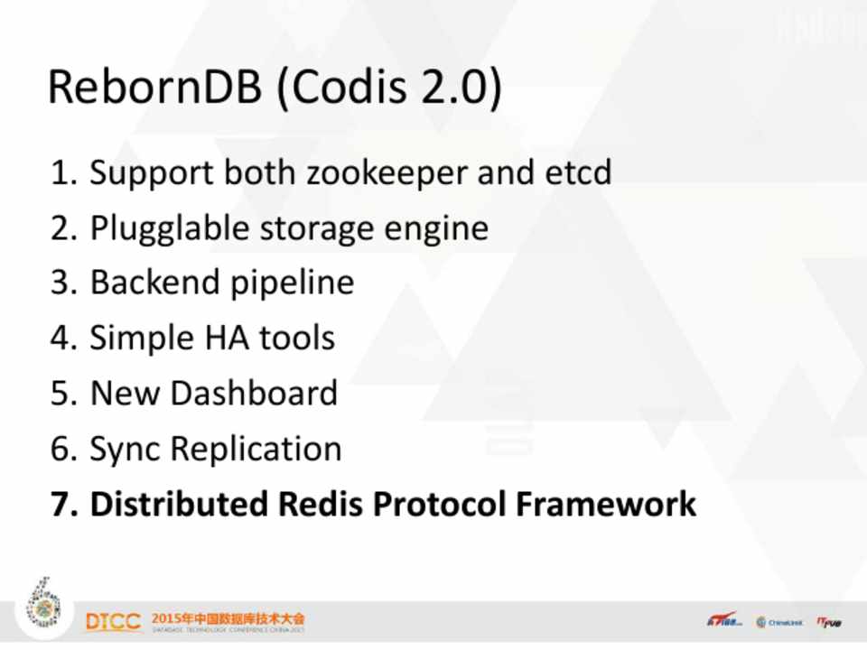 1. Support both zookeeper and etcd 2. Plugglable storage engine 3. Backend pipeline 4. Simple HA tools 5. New Dashboard 6. Sync Replication 7. Distributed Redis Protocol Framework
