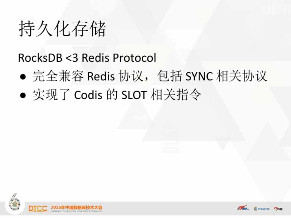 RocksDB <3 Redis Protocol ● 完全兼容 Redis 协议,包括 SYNC 相关协议 ● 实现了 Codis 的 SLOT 相关指令