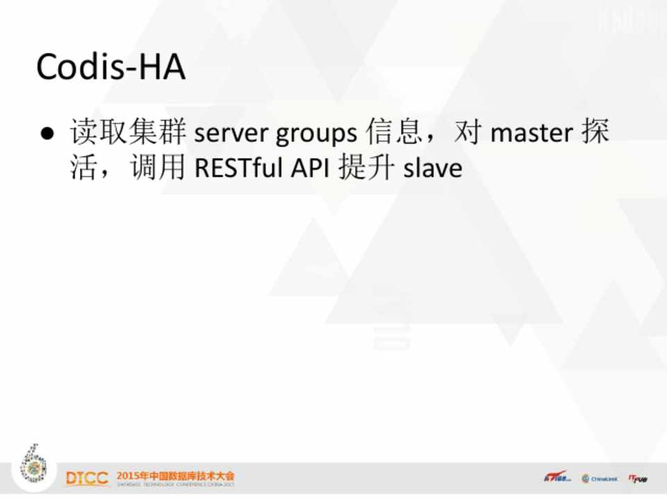 ● 读取集群 server groups 信息,对 master 探 活,调用 RESTful API 提升 slave