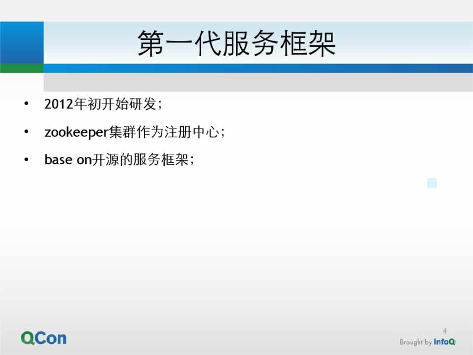 • 2012年初开始研发; • zookeeper集群作为注册中⼼心; • base on开源的服务框架;