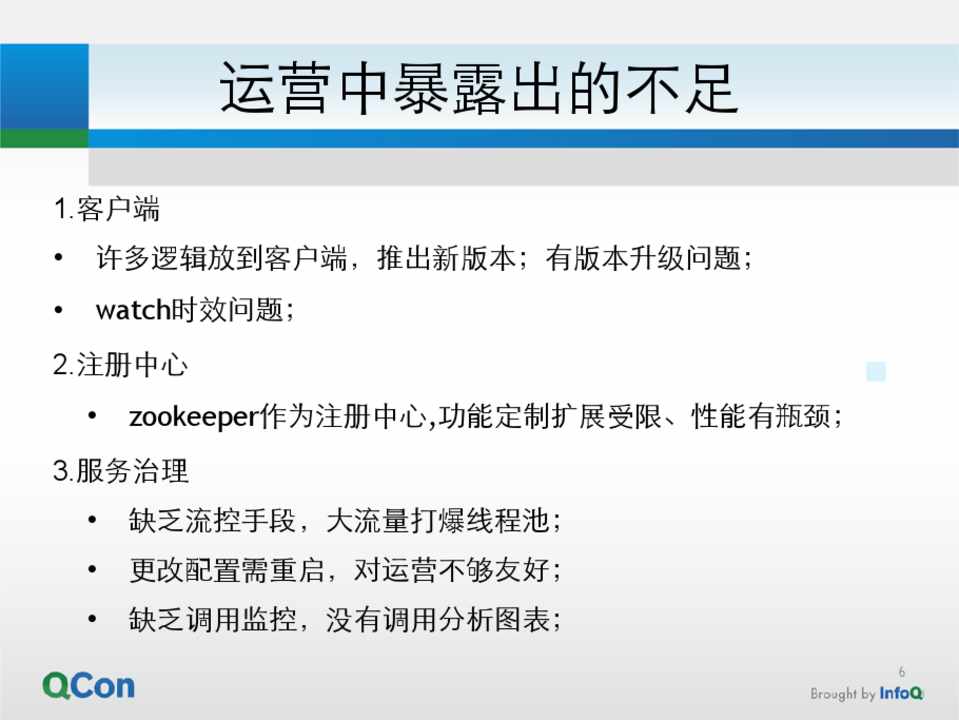 1.客户端 • 许多逻辑放到客户端,推出新版本;有版本升级问题; • watch时效问题; 2.注册中⼼心