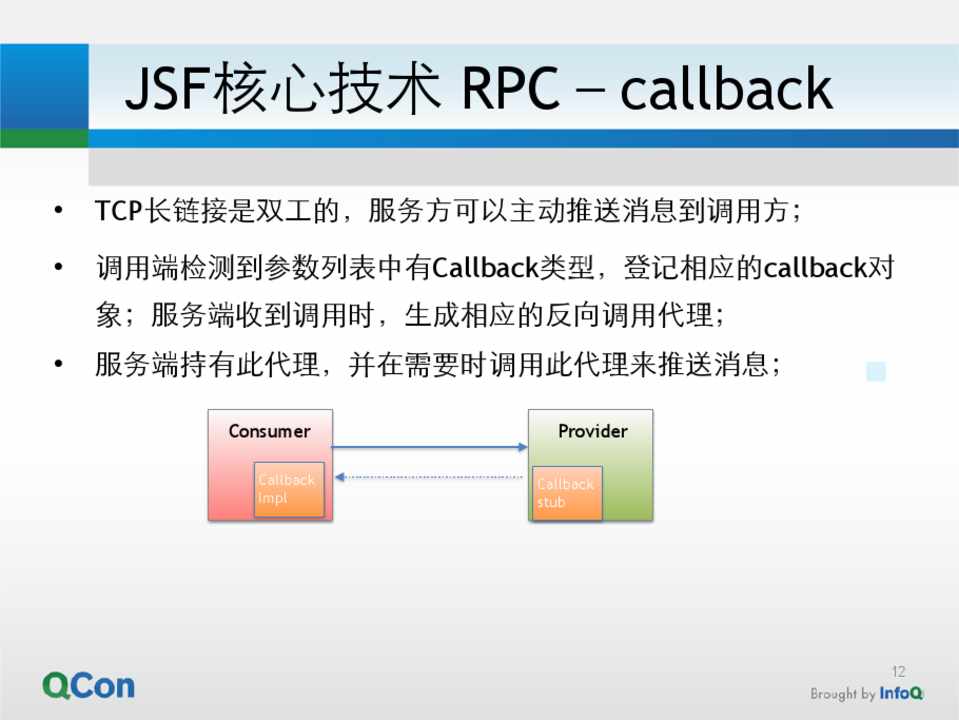 • TCP⻓长链接是双⼯工的,服务⽅方可以主动推送消息到调⽤用⽅方; • 调⽤用端检测到参数列表中有Callback类型,登记相应的callback对