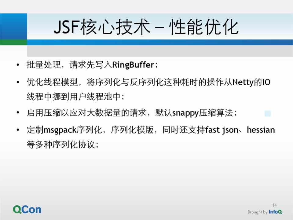 线程中挪到⽤用户线程池中; • 启⽤用压缩以应对⼤大数据量的请求,默认snappy压缩算法; • 定制msgpack序列化,序列化模版,同时还⽀支持fast json、hessian