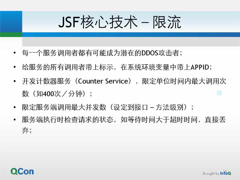 数(如400次/分钟); • 限定服务端调⽤用最⼤大并发数(设定到接⼝口-⽅方法级别); • 服务端执⾏行时检查请求的状态,如等待时间⼤大于超时时间,直接丢