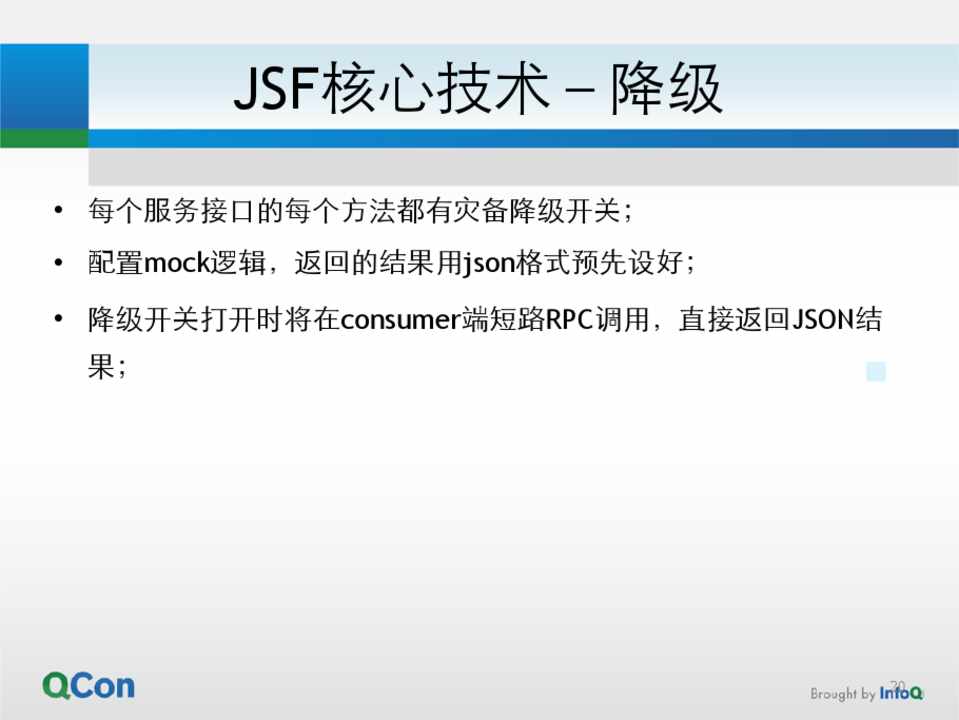 • 每个服务接⼝口的每个⽅方法都有灾备降级开关; • 配置mock逻辑,返回的结果⽤用json格式预先设好; • 降级开关打开时将在consumer端短路RPC调⽤用,直接返回JSON结