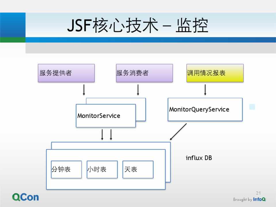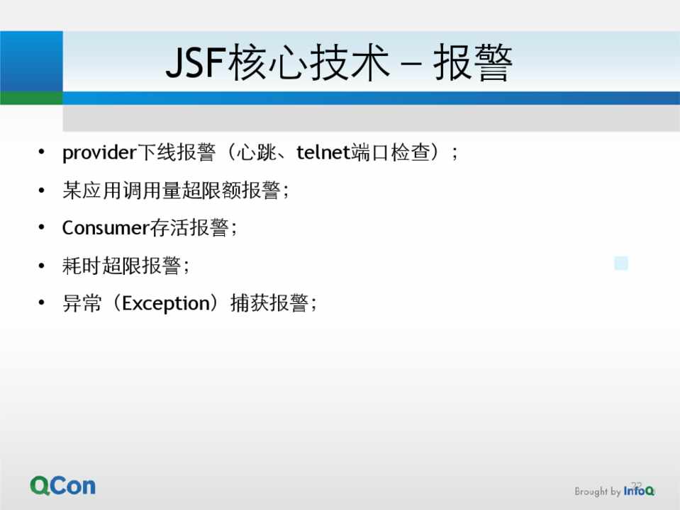 • provider下线报警(⼼心跳、telnet端⼝口检查); • 某应⽤用调⽤用量超限额报警; • Consumer存活报警; • 耗时超限报警; • 异常(Exception)捕获报警;