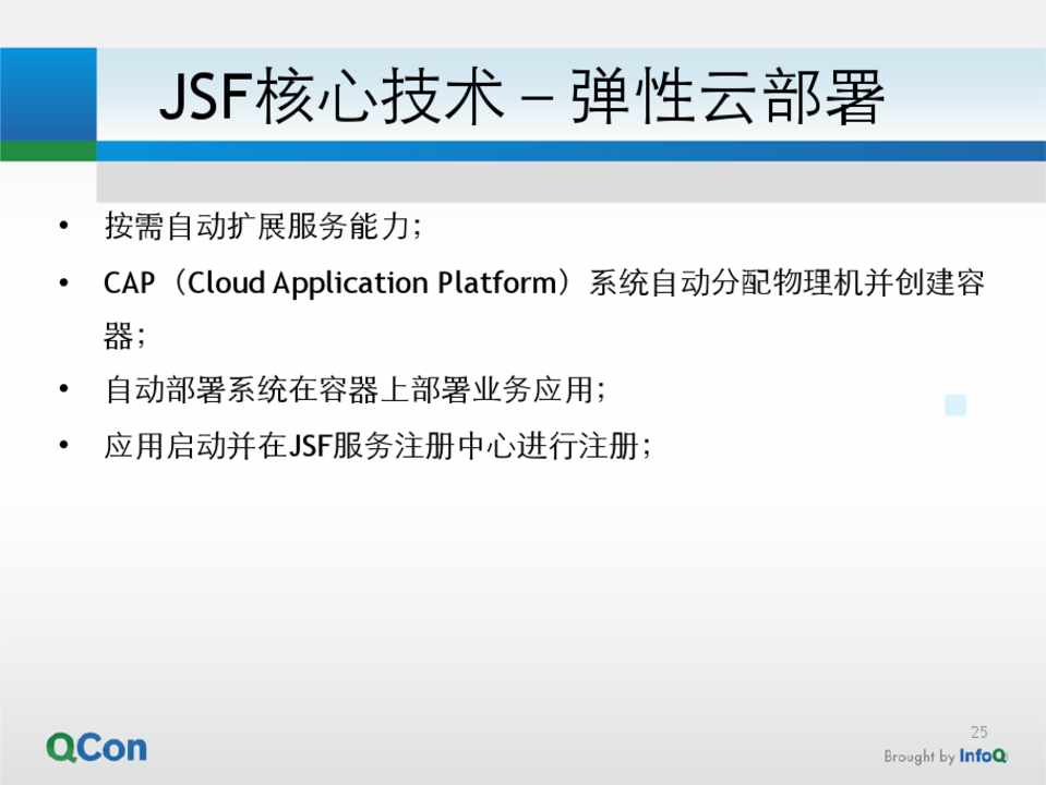 器; • ⾃自动部署系统在容器上部署业务应⽤用; • 应⽤用启动并在JSF服务注册中⼼心进⾏行注册;