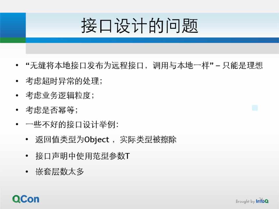 • “⽆无缝将本地接⼝口发布为远程接⼝口,调⽤用与本地⼀一样”-只能是理想 • 考虑超时异常的处理; • 考虑业务逻辑粒度; • 考虑是否幂等; • ⼀一些不好的接⼝口设计举例: