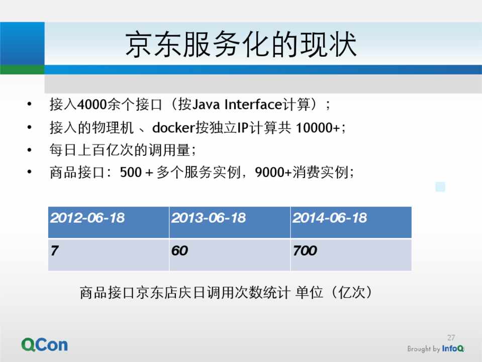 • 接⼊入4000余个接⼝口(按Java Interface计算); • 接⼊入的物理机 、docker按独⽴立IP计算共 10000+; • 每⽇日上百亿次的调⽤用量; • 商品接⼝口:500+多个服务实例,9000+消费实例;